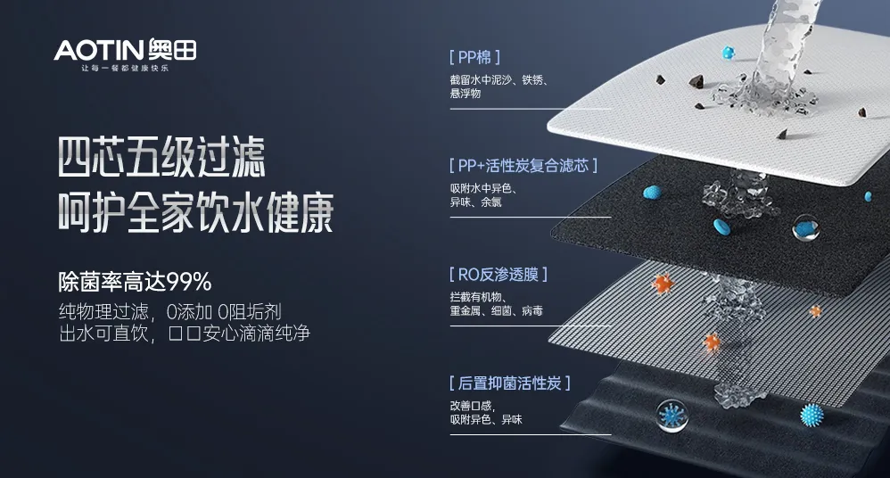 奧田凈水器ARO-T1600搭載四芯五級高效過濾系統(tǒng),以0.0001微米RO反滲透膜為核心,層層攔截泥沙、鐵銹、細(xì)菌、病毒及重金屬等有害物質(zhì),TDS值實時監(jiān)測讓水質(zhì)可視化。此外,搭載1600G超大通量設(shè)計實現(xiàn)4.12L/min的澎湃流速,2秒即可接滿一杯150ml水,滿足多人同時用水需求,實現(xiàn)即濾即飲,鮮活無陳。