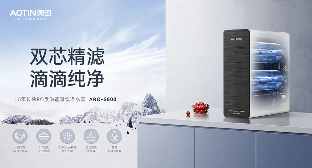 奧田凈水器ARO-S800雙芯精濾,滴滴純凈。800G的超大通量,一級(jí)水效,六重自動(dòng)清潔,5年長(zhǎng)效反滲透RO膜,0.0001μm的精濾精度,讓每一滴水都純凈如初。